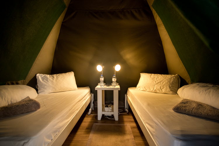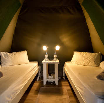 Spacious glamping tent with a king-size double bed or twin beds.| Featuring high-quality white linen, an electric warming blanket in winter, and a cooling fan in summer.| Comes with towels | Power Point | Light | Fridge | Laptop Safe | Coffee Station | Shaded | Mosquito Net | Free Wi-Fi
